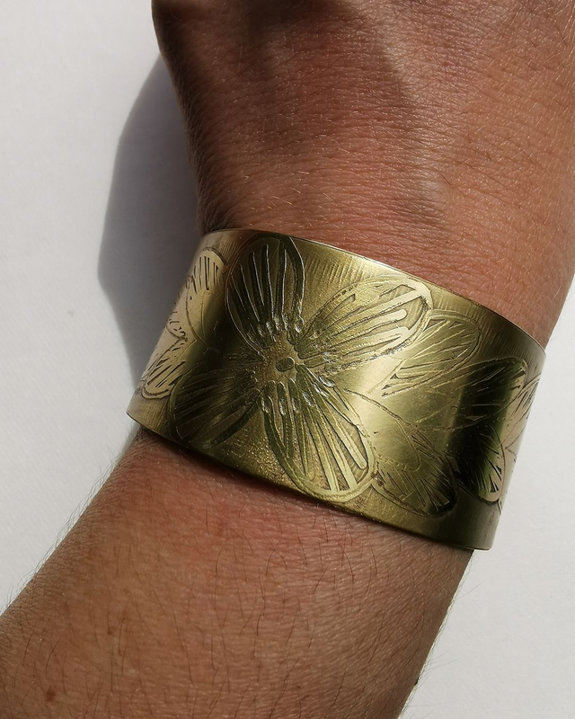 Histoire : Inspirées par les réseaux de la nature (nervures, ramifications, ondulations, zébrures, rayures, sillons, stries…), ces bracelets capturent l’imperfection organique du vivant. Chaque pièce naît d’un dessin gravé à la main, puis révélée par un bain d’acide : le métal, en se rétractant, crée un réseau unique de nervures dorées, comme une empreinte fragile et singulière.